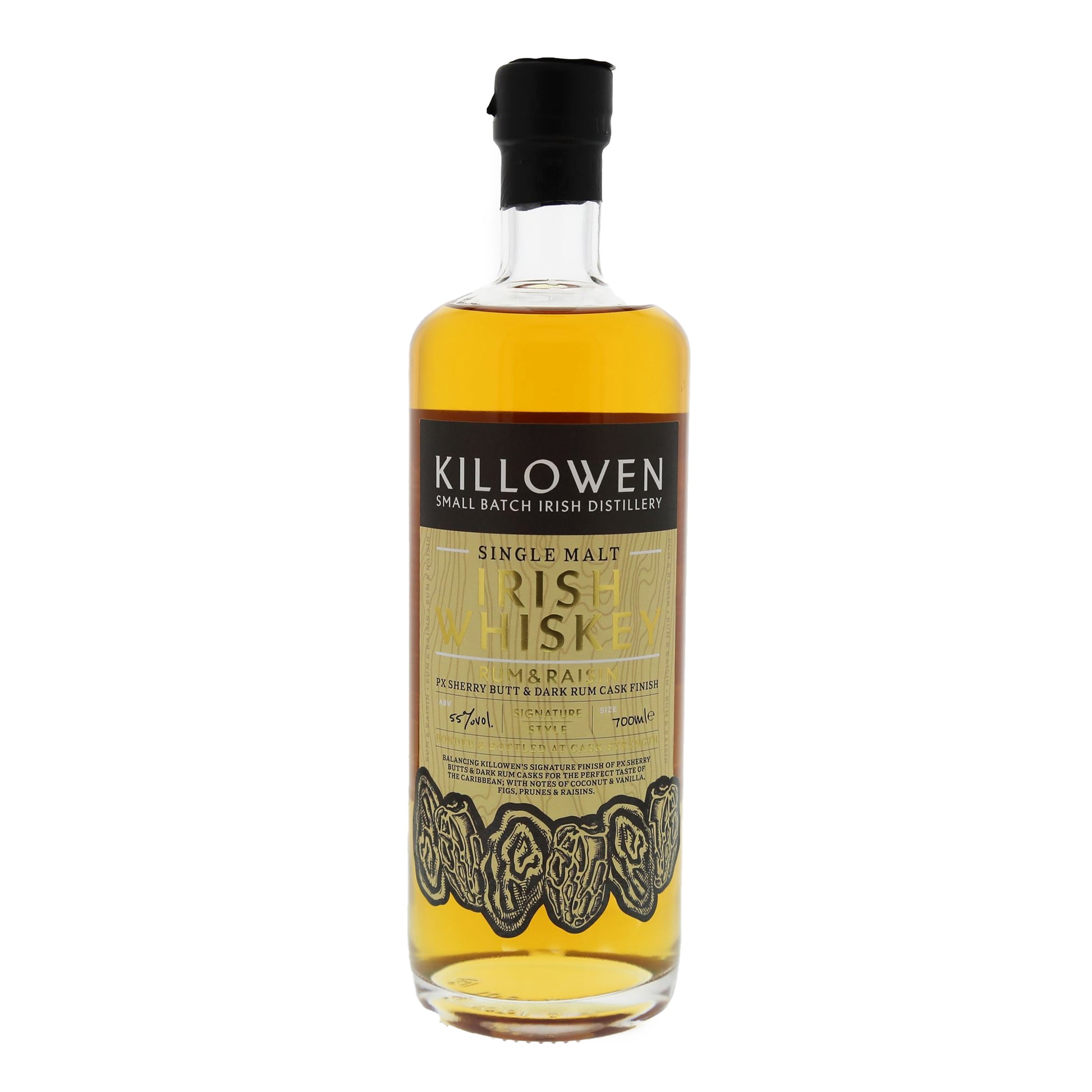 Killowen Single Malt Irish Whiskey Rum & Raisin vereint irische Whiskey-Tradition mit exotischen Noten. Dieser Small Batch Whiskey wird in handgefertigten Kupfer-Pot Stills destilliert und reift zunächst in Eichenfässern. Sein Finish in Dark Rum- und Pedro Ximénez Sherryfässern verleiht ihm ein einzigartiges Geschmacksprofil.